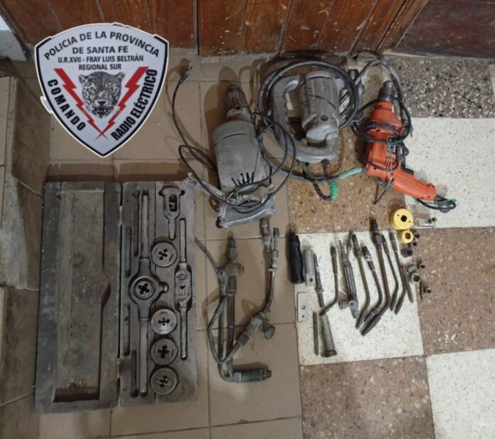 Entre los objetos incautados se encuentran un taladro eléctrico, un taladro industrial color gris, una caladora industrial color gris, un cajón de madera con piezas para realizar roscas (terraja), siete picos de bronce de distintas medidas para soplete y un soplete de material de bronce
