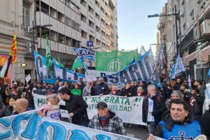 Gremios del Transporte nucleados en la Confederación de Trabajadores del Transporte (CATT) seccional Rosario – Recolectores. Dragado y Balizamiento, Camioneros de Santa Fe, Cadetes de Rosario, Conductores Navales nucleados en Siconara), junto a organizaciones sociales (La CCC , Movimiento Evita, UTEP) entre otras y otros gremios locales (COAD; ATE Rosario) ya avisaron que movilizaran en dicha jornada para expresar su rechazo a las política del gobierno que preside Milei. Este jueves se concentraron desde las 17.30 hs en la denominada Plaza de la Cooperación (Mitre Y Tucuman) para luego marchar al parque España.