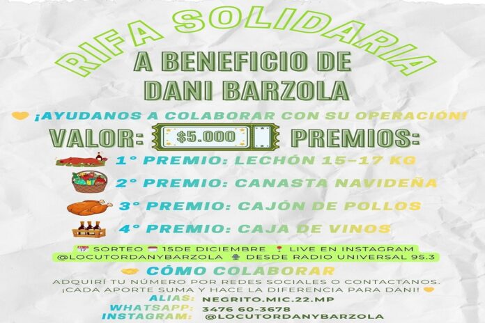 El reconocido locutor Daniel Barzola, quien presta sus servicios en FM Universal de la ciudad de San Lorenzo, entre otros tantos medios de la región, está desde hace 10 años atravesando una artrosis severa en su cadera. La situación está avanzada y dificulta su movilidad, por lo cual necesita una operación y una prótesis de cadera de alto costo, para costear esos gastos se lanzó está una rifa solidaria y prontamente una pollada.