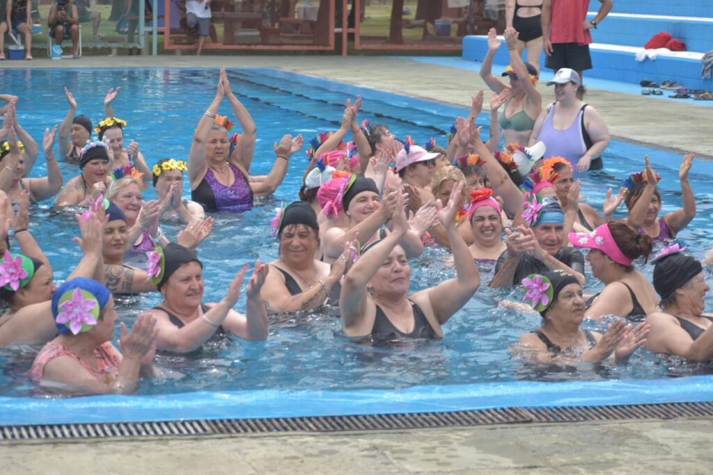 La disciplina de Acuagym que comenzó hace años como una propuesta para adultos mayores, hoy reúne a mujeres de todas las edades que encuentran un espacio de movimiento, salud, contención y sociabilidad. La consigna de esta edición fue “Floral”, por lo que muchas participantes llevaron vinchas, remeras o sombreros decorados con flores.