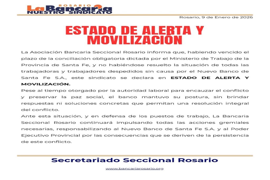 El gremio local sigue exigiendo la reincorporación de unos nueve (9) trabajadores. En ese sentido, acaba de vencerse el plazo de la conciliación obligatoria dictada por el Ministerio de Trabajo de la Provincia de Santa Fe, “y no habiéndose resuelto la situación de todas las trabajadoras y trabajadores despedidos sin causa”, en dicho banco “este sindicato se declara en Estado de Alerta y Movilización”, emitió en un comunicado la Bancaria Rosario