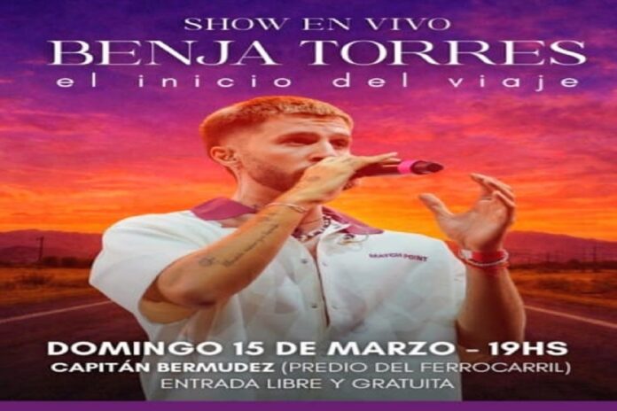 Este 15 de marzo desde las 19 hs, Benja Torres se presentará en Capitán Bermúdez, en el marco de los festejos de un nuevo aniversario de la ciudad. Será en el Predio del Ferrocarril.