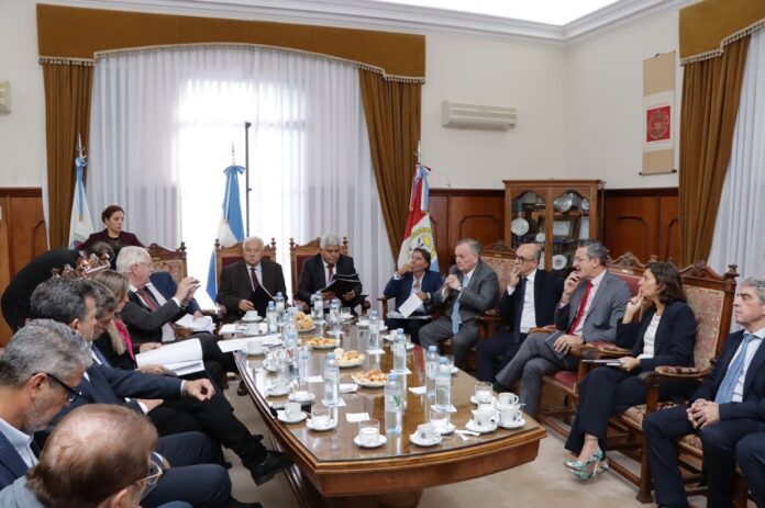La Corte Suprema de Justicia, presidida por Rafael Gutiérrez e integrada por Roberto Falistocco, Daniel Erbetta, Jorge Baclini, Rubén Weder y Margarita Zabalza, encabezó un encuentro con senadores y diputados provinciales representantes de las distintas fuerzas políticas que integran la legislatura provincial.